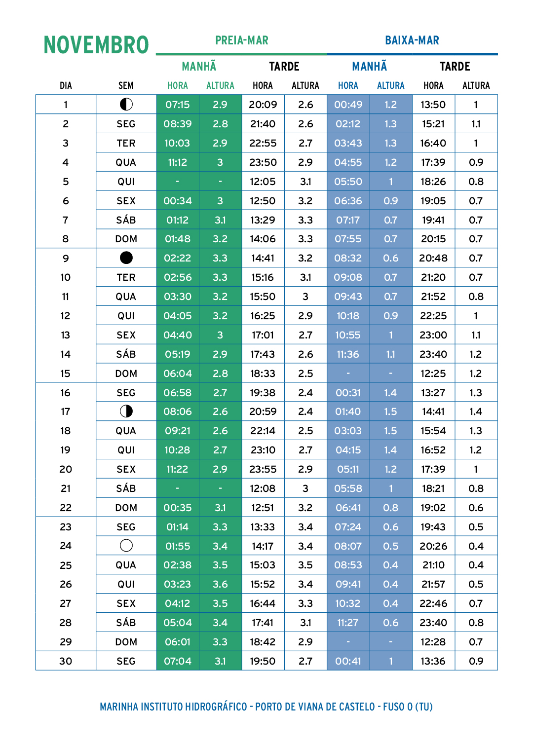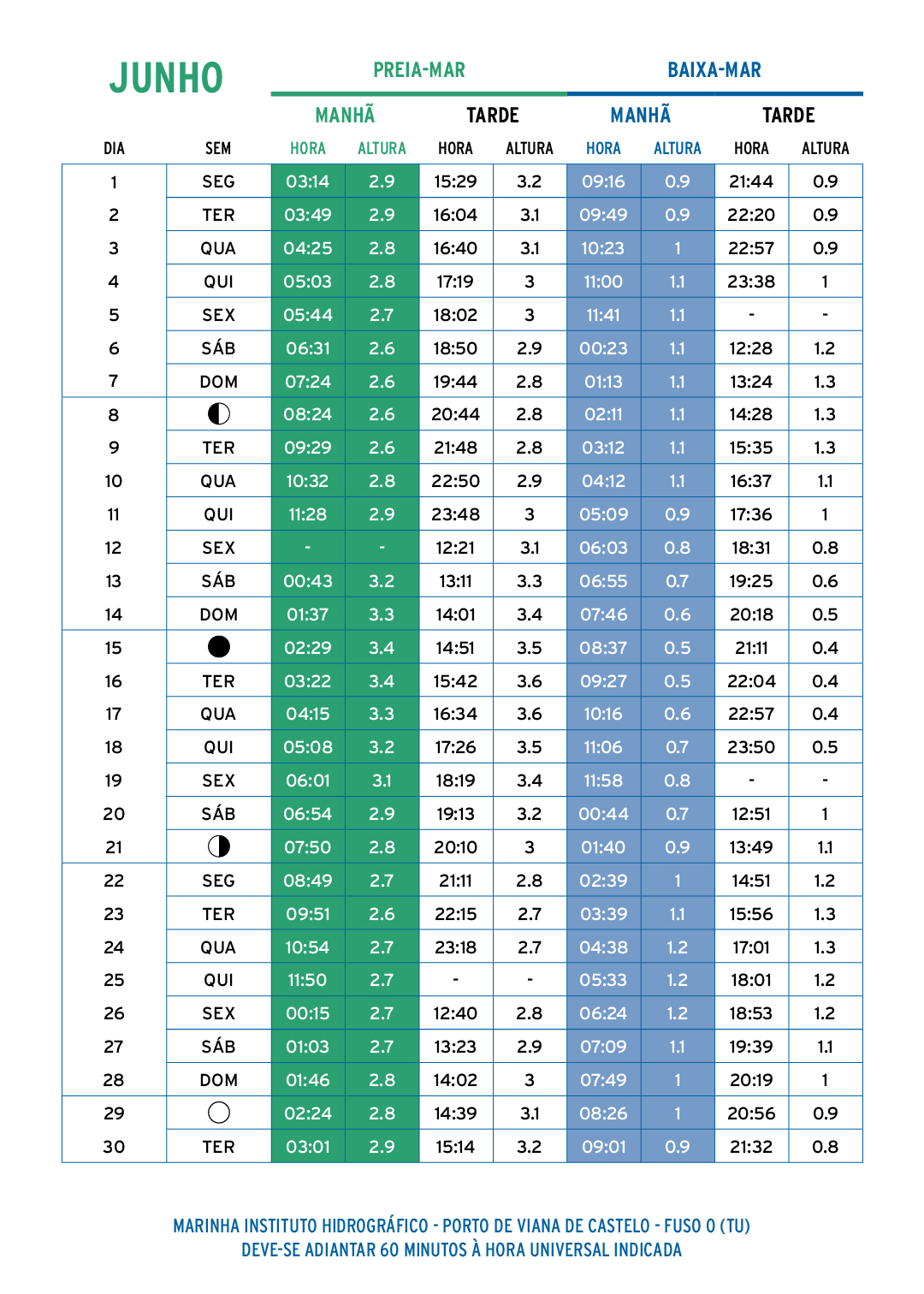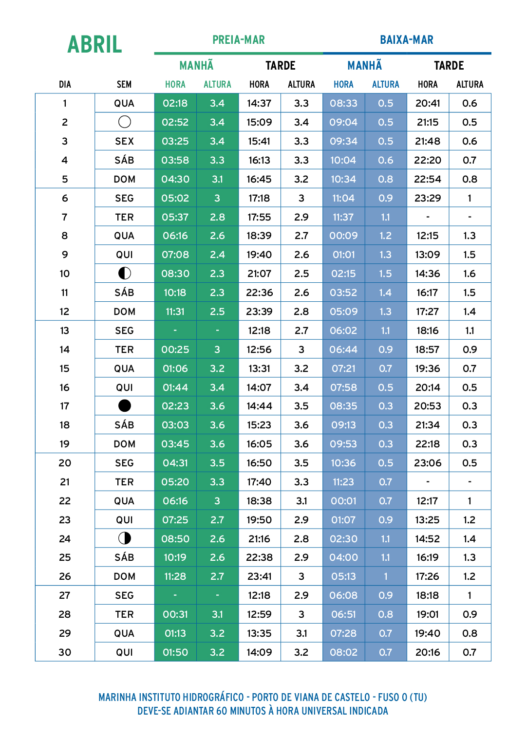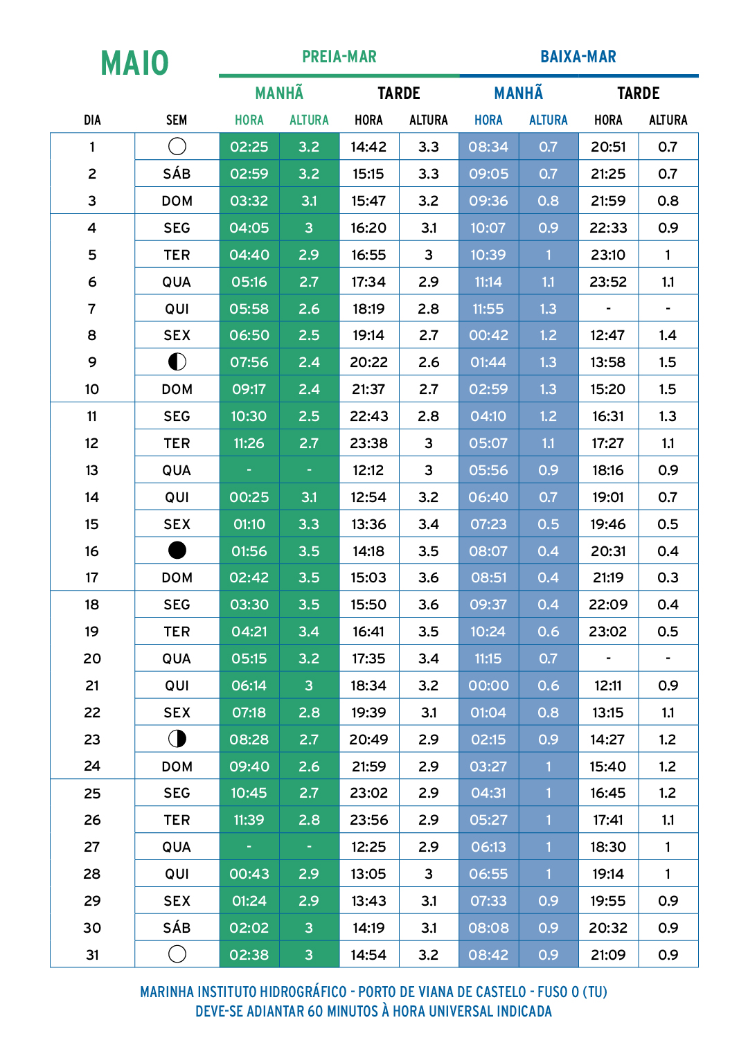 Os valores indicados na tabela podem ser bastante diferentes dos valores reais em consequência da variação do nível médio do mar, principalmente devidas à ação das condições atmosféricas.