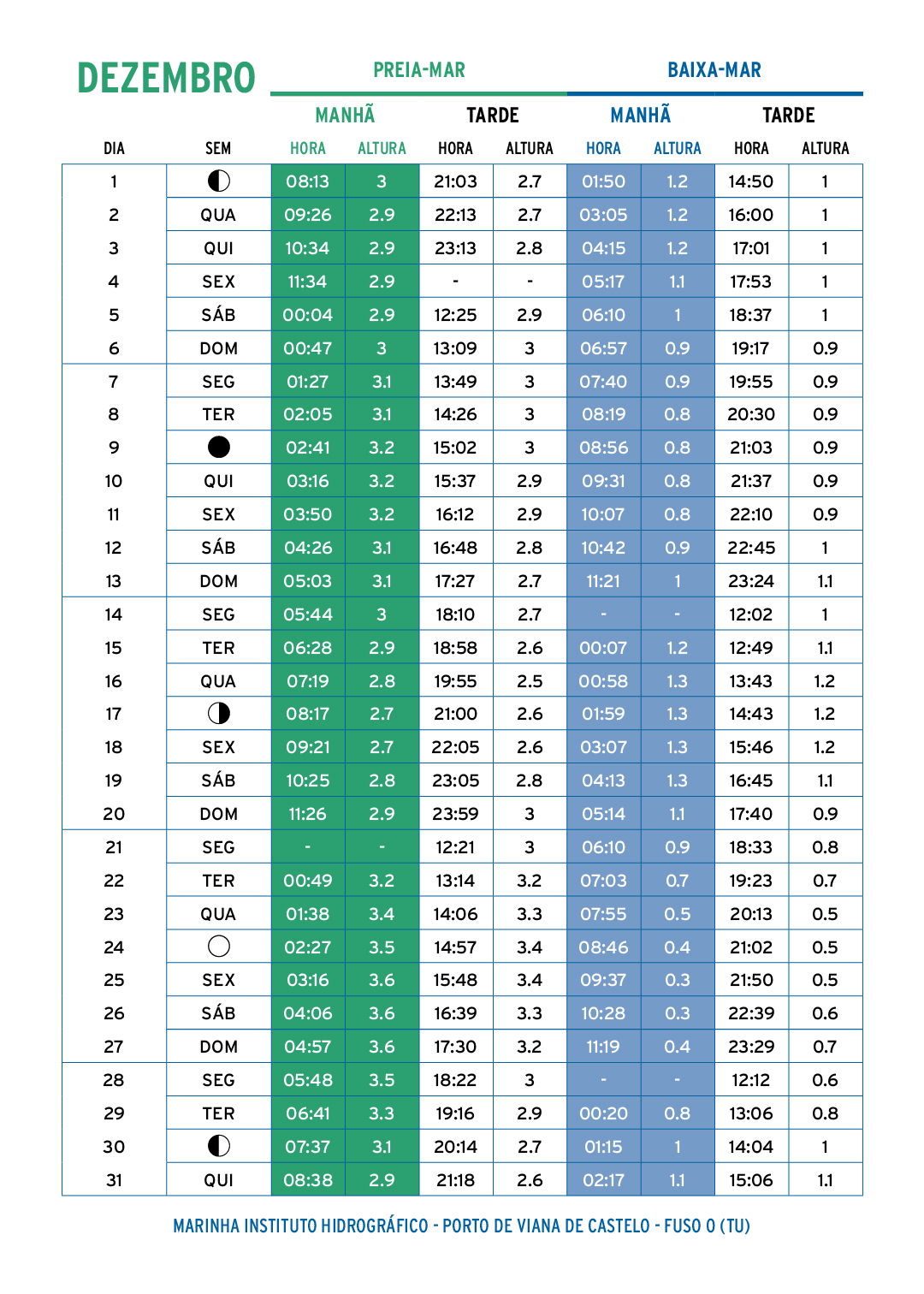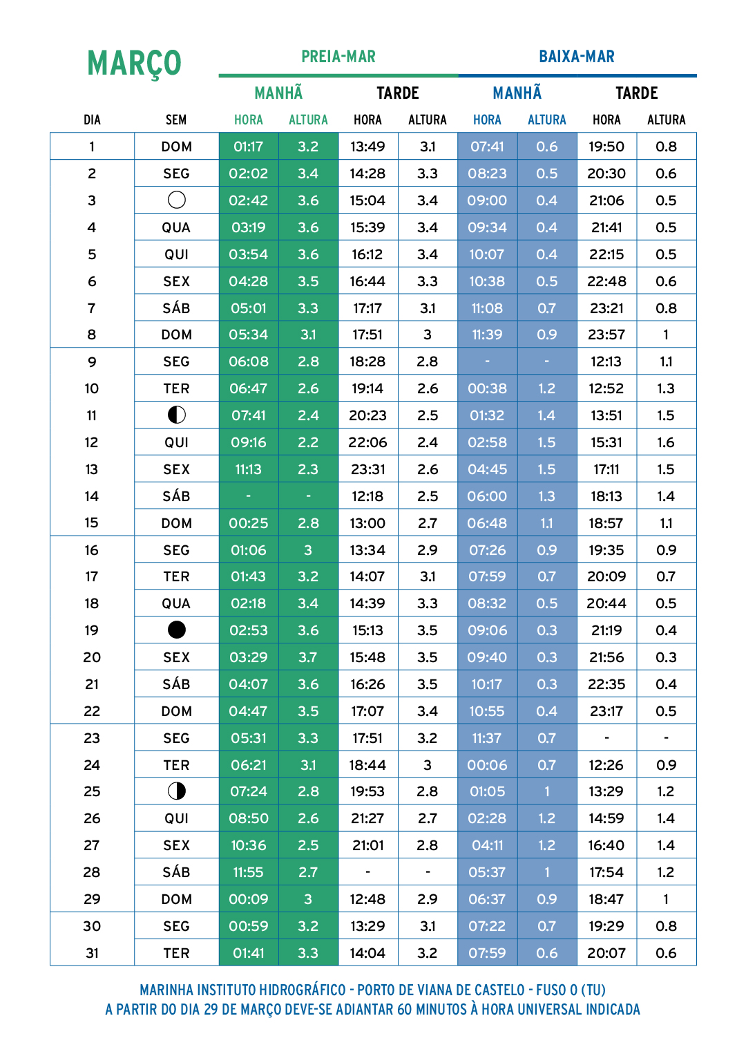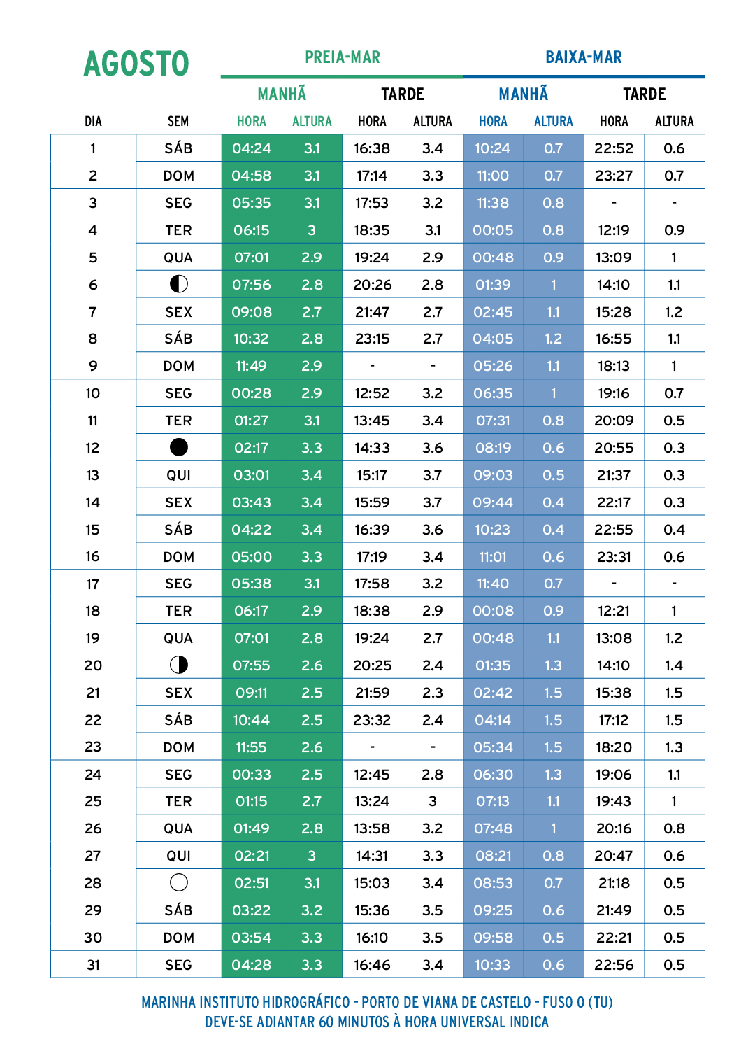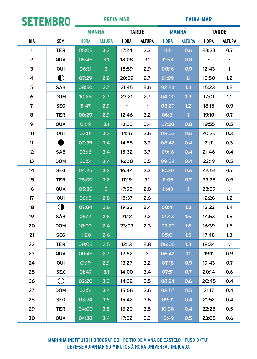Os valores indicados na tabela podem ser bastante diferentes dos valores reais em consequência da variação do nível médio do mar, principalmente devidas à ação das condições atmosféricas.